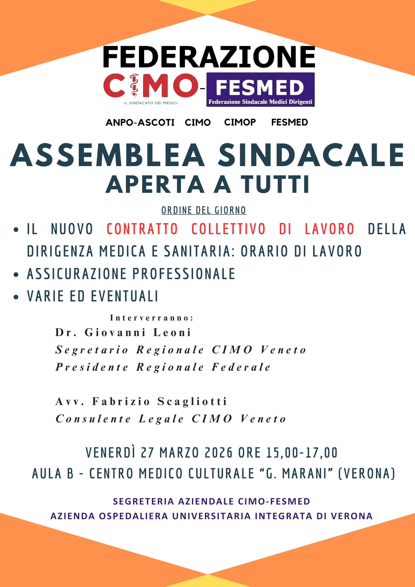 ven U20 mar 2026 l t i m e N o t i z i e | 27 marzo 2026 ore 15,00 AULA B Centro Medico Culturale "G. MARANI" (VERONA) - ASSEMBLEA SINDACALE APERTA A TUTTI Parleremo del nuovo CCNL della Dirigenza Medica e Sanitaria (Orario di Lavoro) e dell'Assicurazione Professionale.NON MANCARE! |