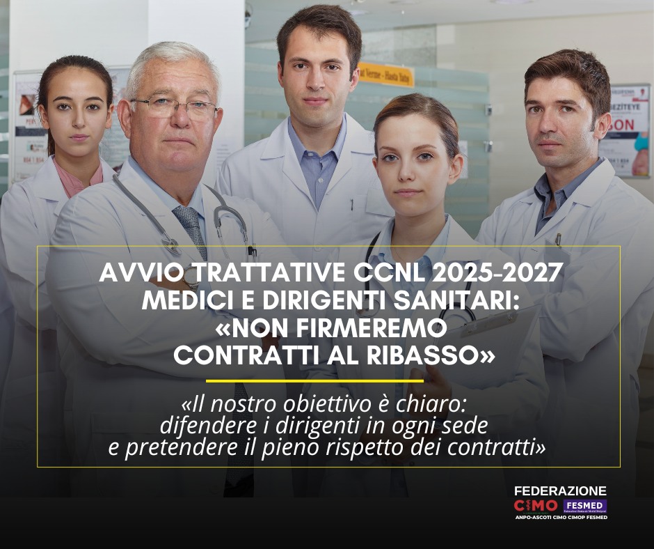mar U7 apr 2026 l t i m e N o t i z i e | Comunicato Stampa CIMO-FESMED - AVVIO TRATTATIVE CCNL 2025-2027 MEDICI E DIRIGENTI SANITARI: NON FIRMEREMO CONTRATTI AL RIBASSO «Il nostro obiettivo è chiaro: difendere i dirigenti in ogni sede e pretendere il pieno rispetto dei contratti»Roma, 7 aprile 2026 – Il 29 aprile si aprirà all’Aran la (continua...) |