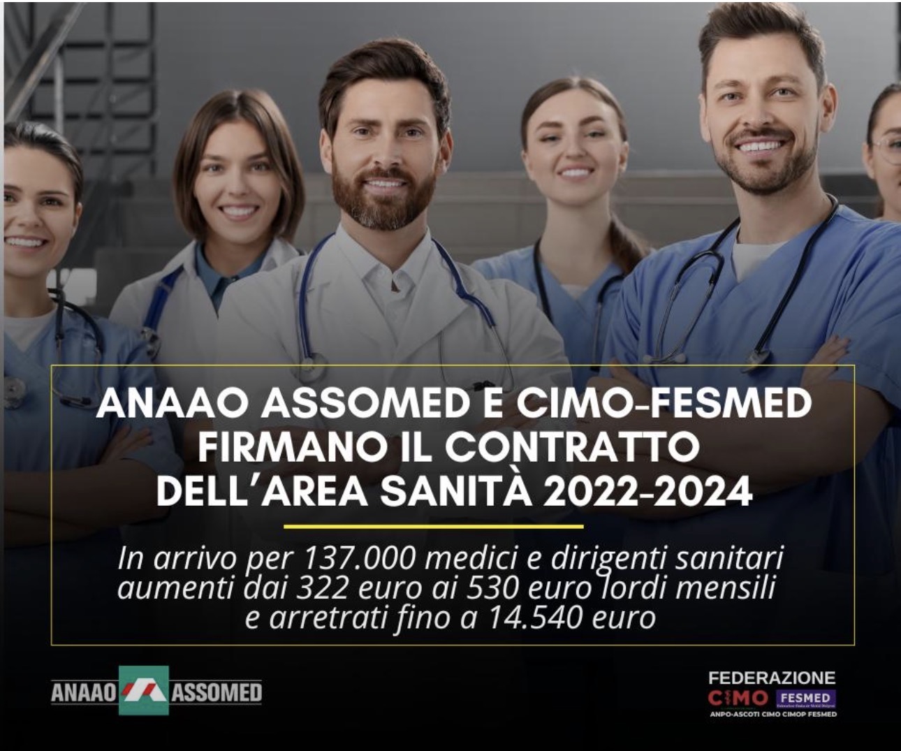 ven U27 feb 2026 l t i m e N o t i z i e | Firmato oggi presso l’ARAN, il Contratto Collettivo Nazionale di Lavoro dei medici e dei dirigenti sanitari relativo al triennio 2022-2024 Le organizzazioni sindacali ANAAO-ASSOMED e Federazione CIMO-FESMED hanno firmato questa mattina, presso l’ARAN, il Contratto Collettivo Nazionale di Lavoro dei medici e dei dirigenti sanitari relativo al triennio 2022-2024. Dopo la (continua...) |