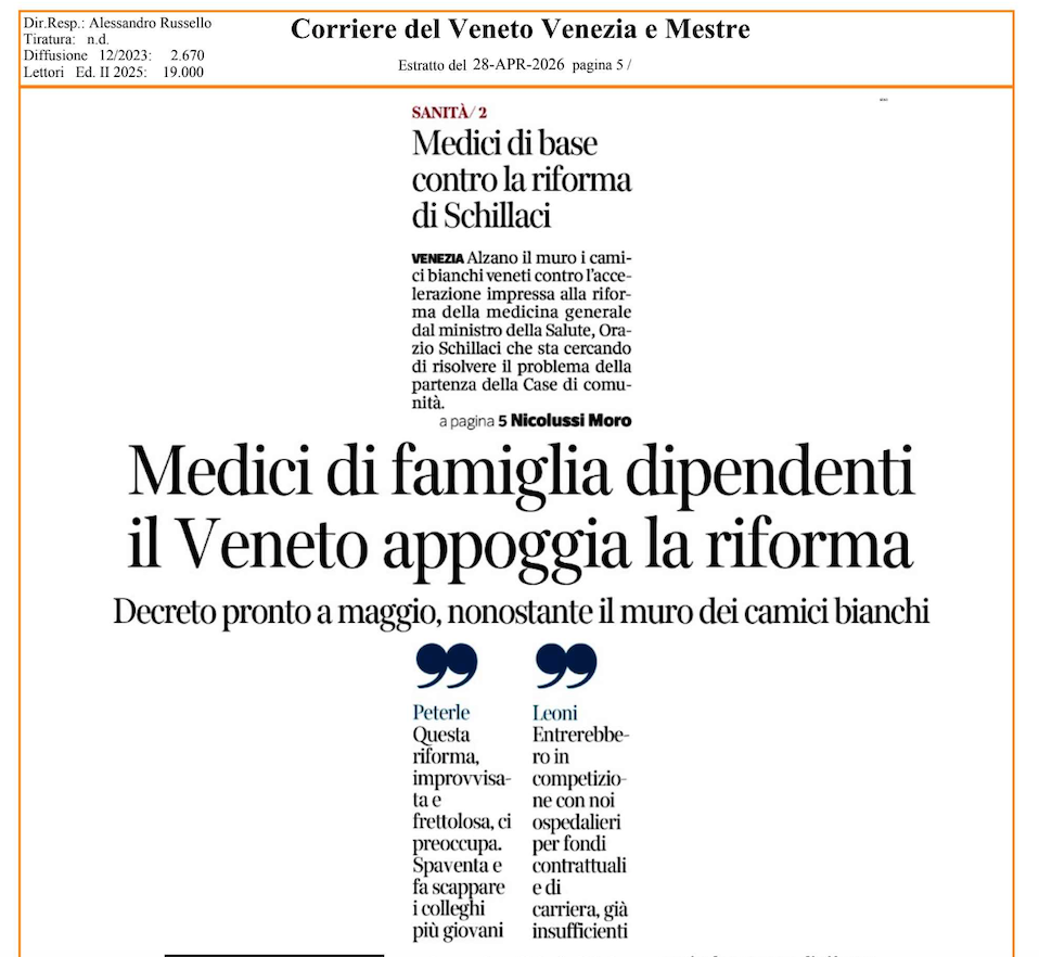 sab R25 apr 2026 a s s e g n a S t a m p a | Leoni: In una medicina moderna il rispetto delle condizioni di lavoro dei medici deve iniziare dalla Scuola di Specializzazione - Corriere del Veneto (articolo di Roberta Polese) Se siamo arrivati ad un esposto in Procura le condizioni di lavoro In Ginecologia ed Ostetricia a Verona dovevano essere decisamente crtitiche sotto molti aspetti. Gli Specializzandi sono medici (continua...) |