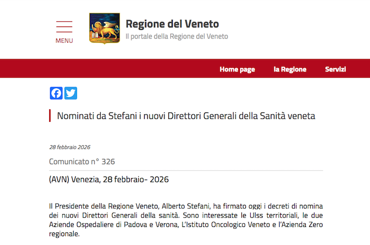 sab R28 feb 2026 a s s e g n a S t a m p a | Comunicato stampa della Regione Veneto: i nuovi Direttori Generali della sanità. Il Presidente della Regione Veneto, Alberto Stefani, ha firmato oggi i decreti di nomina dei nuovi Direttori Generali della sanità. Sono interessate le Ulss territoriali, le due Aziende Ospedaliere di Padova (continua...) |