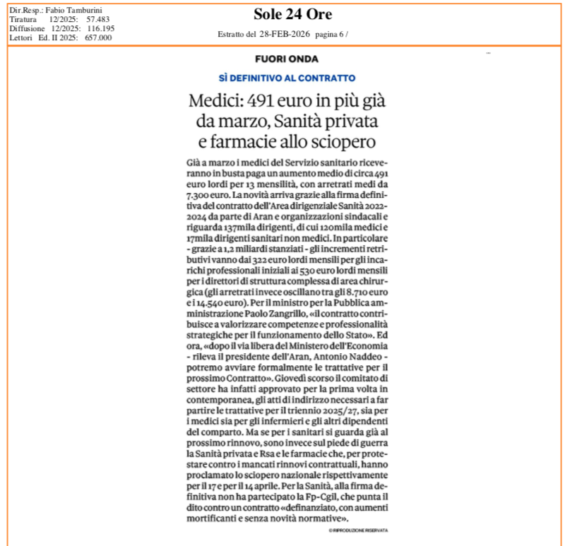 ven R2 gen 2026 a s s e g n a S t a m p a | Il Sole 24 Ore del 2 gennaio 2026 commenta come insufficienti gli aumenti contrattuali per medici ed infermieri (articolo di Marzio Bartoloni)![]() |